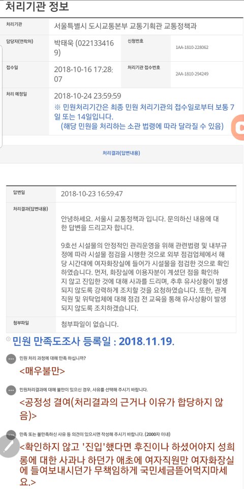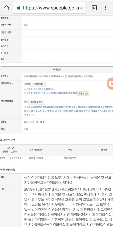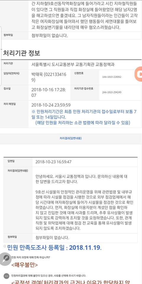 2018년10월16일13시57분경9호선여자화장실에 남자직원2명이 여자화장실에 들어온 일 신고하네요. 화장실에 저 혼자 있었기에 아무도 지하철직원을 호출한 일이 없었고 화장실내 시설 아무 고장도 목격하지못했습니다. 악의적인 의도라고 보일 수 있는 일이었지만 직원들은 핑계만 댈 것이 분명하기에 그러한 남직원들은 지하철전체이용시간인 대략5~24시간에 여자화장실에 들어가지말라는 기본적인 교육이 되어야할 것 같군요. 그 시간 지하철9호선동작역화장실에 들어가라고 시킨 지하철직원들이 있다면 그 직원들과 직접 화장실에 들어왔었던 해당 남자2명을 해고하셨으면 좋겠네요. 그 남자직원들이라는 인간들이 고작 작은 여자화장실에 들어와서 했던 행동들이 세면대물을 틀어보고 화장실변기물을 내리던데 매우 혐오스러웠습니다.