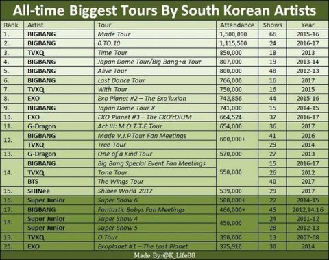 1위 made 투어는 150만명이아니라 66회공연 120~130만명이라고 추정