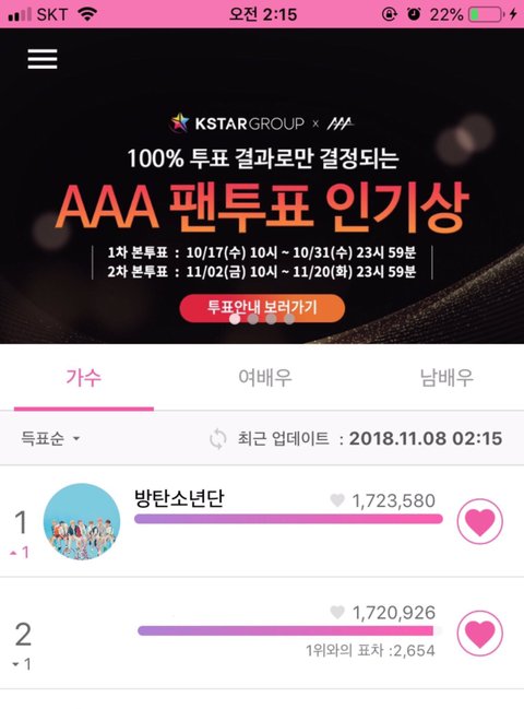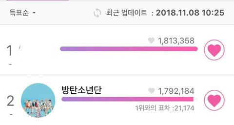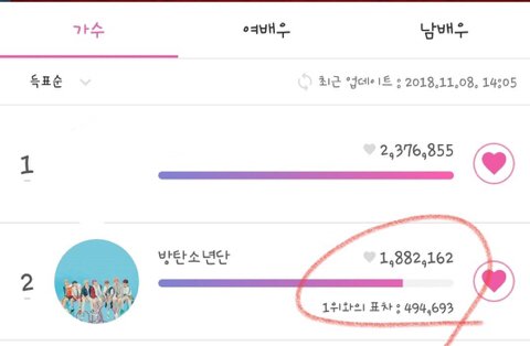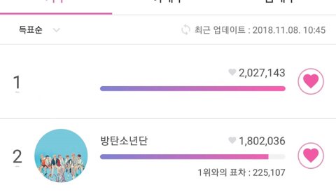 +요약하자면 거의 계속 우리가 1위였던 투표였고 타팬덤 투표수 겁나 깎인 날 오전도 우리가 1위 였음 그러다 갑자기 역전당해서 4시간만에 격차 50만표로 불어났고 타팬덤은 부정투표로 표수 깎임