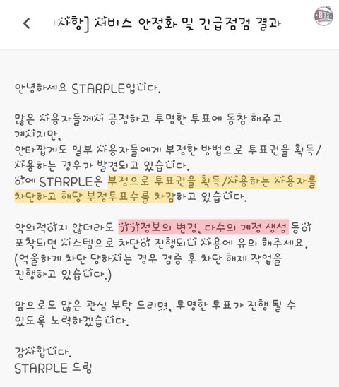 부정투표 깎인 이유도 공지 다되있음 그니까 그냥 비정상인 표 깎인거 맞으니까 혹시 엔터에 이상한 글 올라오면 불안해하지 말라고 ㅇㅇ