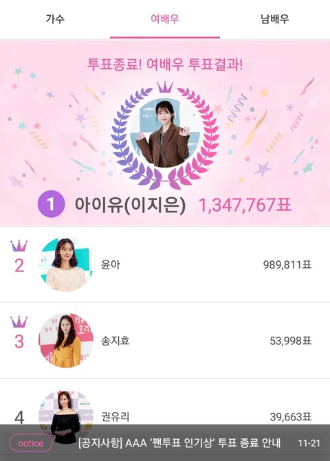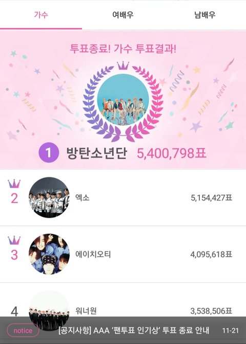 AAA 인기상 투표 결과