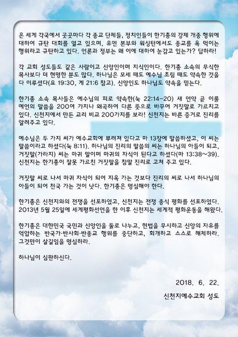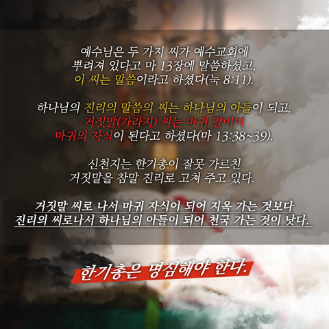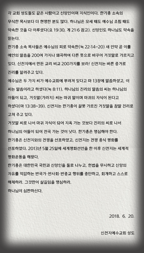 한기총은 갖은 죄란 죄는 다 지으면서 남을 핍박하고 저주하고 거짓말을 잘 하여도 정통이고 천국 가고, 신천지는 신약의 약속의 말씀대로 가감 없이 지키고 신앙을 해도 이단이고 지옥 가는 것입니까? 이 법은 성경이 아닌 한기총의 마귀 법입니다.