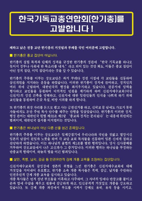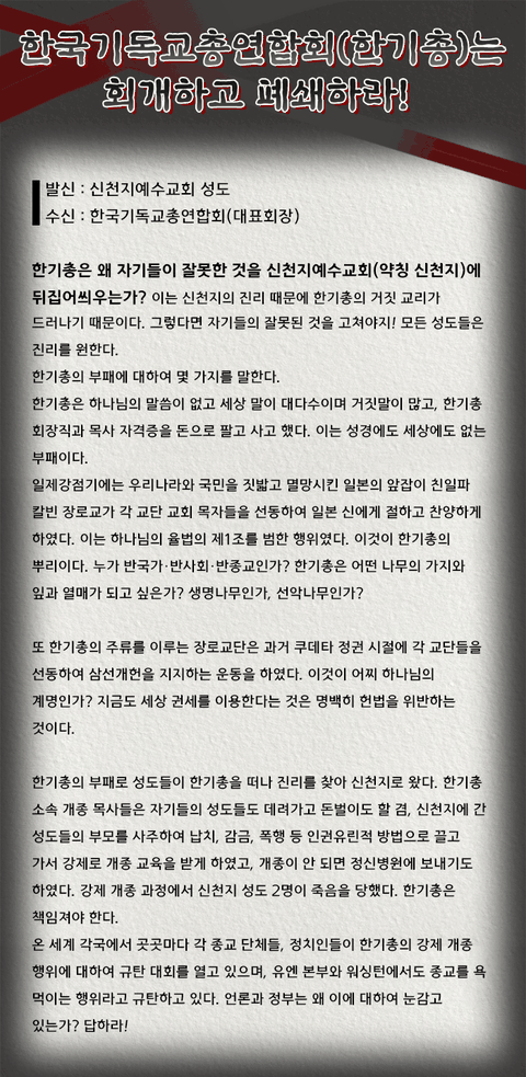 한기총은 신천지예수교회(약칭 신천지)를 반국가·반사회·반종교라 하였고 이단이라 하였습니다. 마치 2천 년 전 무지한 예루살렘 마귀 목자들이 예수님을 이단 마귀라고 한 것같이 하였습니다.