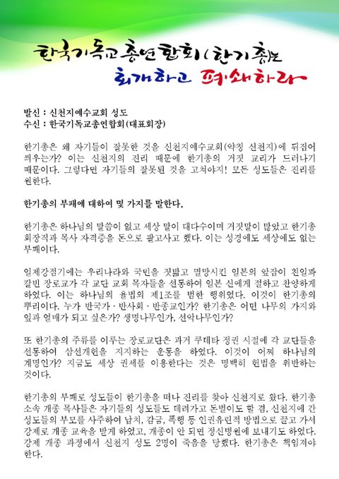 하나 진짜 반국가·반사회·반종교 이단은 한기총입니다. 국내외 각 신문에 보도된 것같이, 한기총의 주류인 장로교단은 일제강점기에 우리나라를 짓밟은 일본의 앞잡이 친일파가 되어 일본 신에게 절하고 찬양하였으며, 군수물자를 제공하였고, 청년들을 일본(군대)에게 잡아다 주었으며, 교회 종까지 떼다가 바쳤습니다. 그리고 지금 한기총은 대표회장직과 목사 안수증까지 돈으로 팔고 사고 했으니, 6천 년 성경 역사 중 반국가·반사회·반종교 이단 한기총 같은 대죄인은 없었습니다. 이것이 정통입니까?
