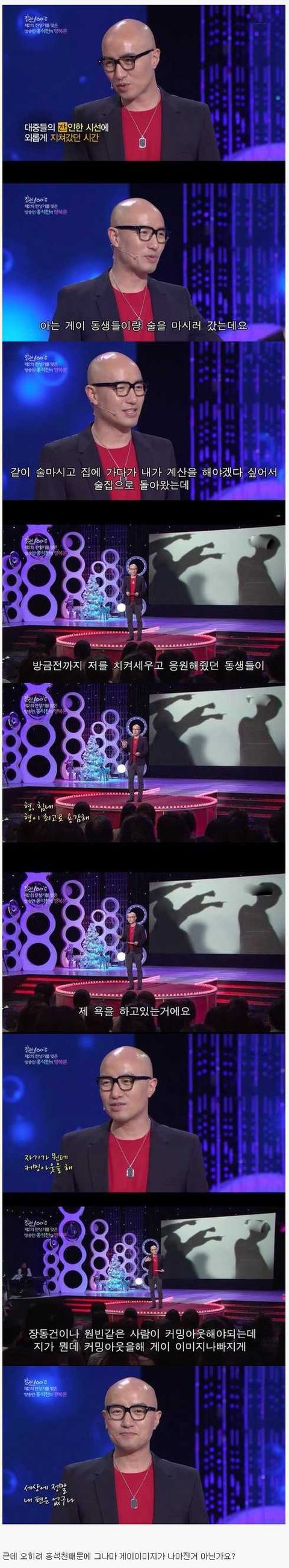 홍석천땜에 게이이미지 좋아진건 최근이고... 저분이 커밍아웃한지 한 20년 되지않았음? 초기에는 지금처럼 사업 잘될때도 아니고 온갖 세상욕은 다 먹고 아주 난리가 났음... 옛날이라 사람들이 게이에 대해 잘 모를때이기도 하고. 솔직히 난 홍석천 자살이라도 하지않으려나 걱정했었음. 그 시기를 십몇년을 버틴거야. 자기 할 일 묵묵히 하면서...... 대단한 사람임