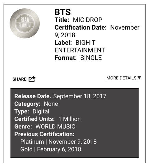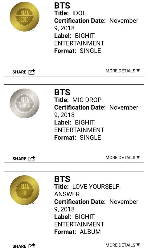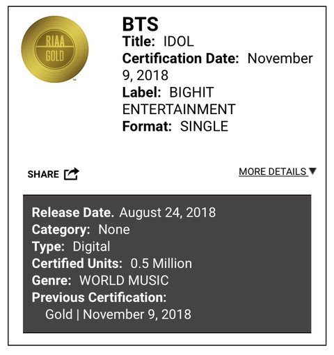RIAA 맠드랍 플래티넘, 아이돌&앤써 골드!!