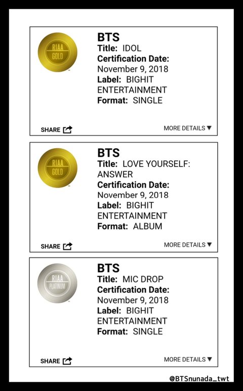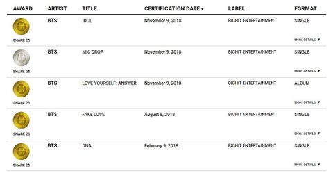박수쳐 빨리 ᆞMIC DROP - 1st 플래티넘인증 ᆞIDOL - 4th 골드인증 ᆞLY:Answer - 1st 골드인증 앨범