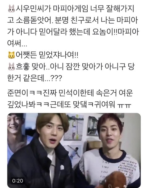 무엇보다 중요한건마피아게임에서 친구를 절대 마피아로 의심하지않는 믿음! 그게 제일 중요해여ㅠㅠㅠ 그렇쿤여 게임에서조차 절대 친구를 마피아로 의심하지않는 믿음! 그 진정한 우정이 진짜 비결이라는 마피아게임에서 죽은 경찰 수호의 시우민잡이 비결이었습다ㅠㅠㅠ