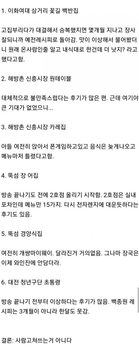 내가 가고 싶은 가게는 덴돈집하고 횟집ㅋㅋㅋ덴돈 방송나가고 사람 엄청 많아서 사장 스스로도 튀김 완성도 60퍼밖에? 안된다고 백종원한테 조언 구하는거 보고 이 방송에서 제일 나은 가게라고 생각했음..지금은 직원 더 구해서 괜찮을거같은데 진짜 기회 생기면 가고 싶음ㅠㅜ