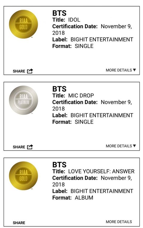 BTS는 총 5개의 노래와 앨범이 미국 RIAA인증을 받게 되었음^^