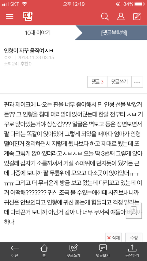 새벽에 다리꼬고 있는거 보고 무서워서 방에 있다가 집에 사람왔길랴 용기내서 봤거든 근데 다리 꺾여있더라 동영상 있는데 혹시 귀신 볼줄아는 애 있나