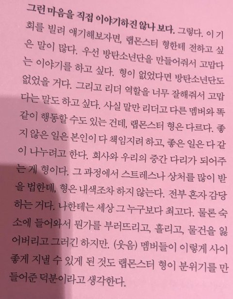 남준이는 방탄정체성의 시작이자 기둥같은존재.난 방탄을좋아하면서 리더라는포지션이 정말 중요하다는걸 느꼈음.리더로서의 기백이 있는데 가끔은 그어깨에 놓인것들을 생각말고 편한날들도 많았으면 좋겠다..