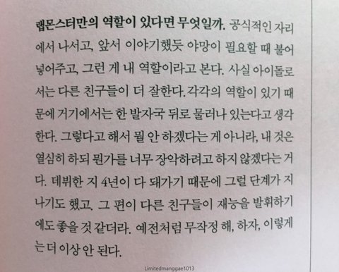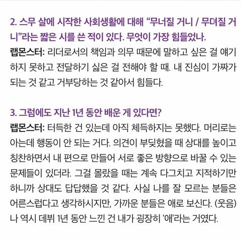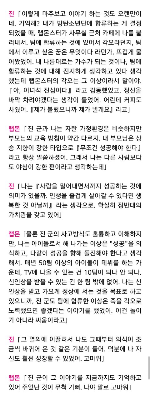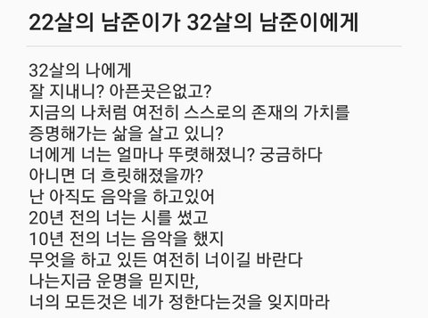 남준이 최고의 역량이 저부분이라고 생각해. 열심히 하되 장악하려고 하지 않는것. 어떻게 이십대에 저걸 알고 실천할까.. 멤버들 각자 엄청난 능력이 있는데 그걸 조화로우면서도 자연스럽게 팀에 녹여내게 하는데 진짜...훌륭한 좋은 리더야. 타고난 특별한 기운이 노력과 만나 많은 사람들을 행복하게 하고 있으니 이제 남은 삶은 좀더 본인이 행복하고 편안하길. 그 모습 바라보면서 같이 나이들어가는게 팬으로서 바라는 유일한 소망이야.
