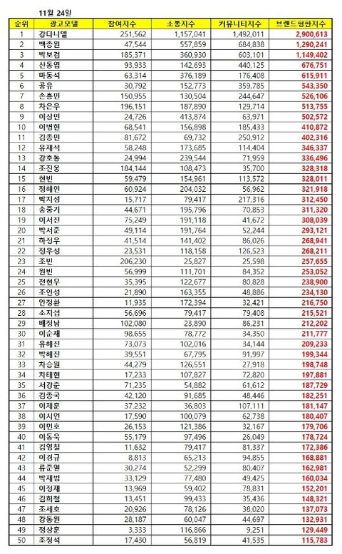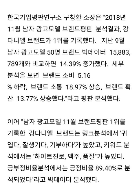 2018년 11월 남자광고모델 브랜드 평판 1위 강다니엘