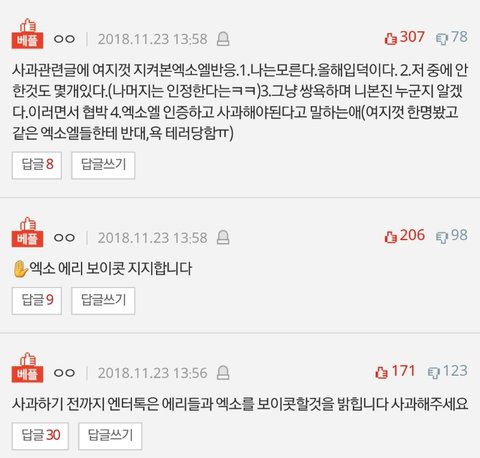 많은사람들이 동의했고 보이콧에 참여하기로 했어. 에리들의 진심어린 사과문과 진정성있게 반성하는마음을 보이기 전까지 엔터톡에서는 엑소와 에리의 어떤 영업글도 동조하지 않는 보이콧을 진행할꺼야. 에리들 무조건 반대만 박지말고 아미인척 먹금하지말고 사과문 써주길 바랄게