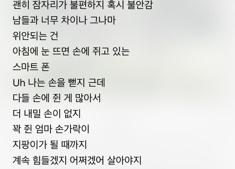 사실 가사 자체는 위로보다는 신세한탄?에 가까운데 듣다 보면 공감이 돼서 위로가 되는 것 같아 ㅠㅠㅠ 들을 때마다 몰입돼서 눈물만 나오는 곡 ..