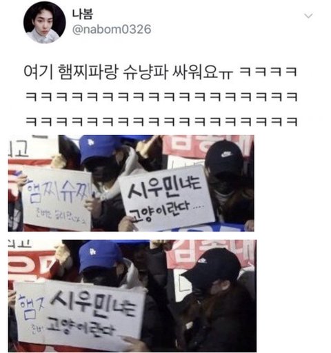 팬들끼리 슈냥이파 햄찌파로 나뉘어서 치열하게 싸우는데 시우민씨 자꾸 그렇게 한쪽편만 들꺼예여?