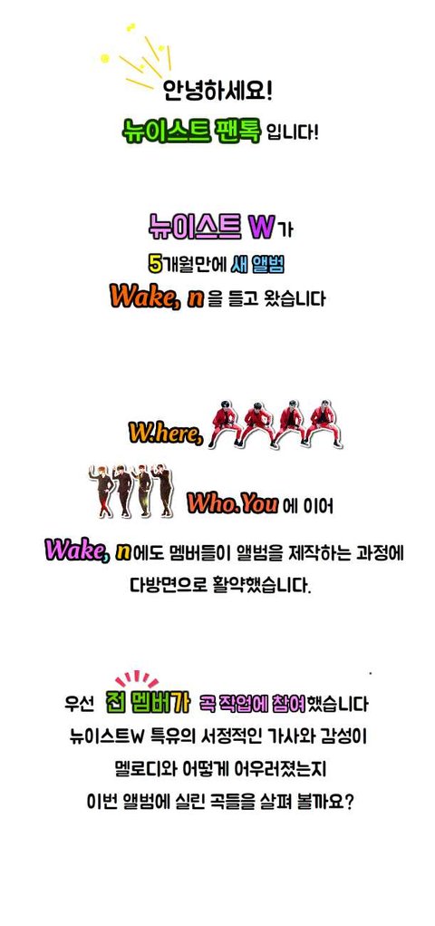 안녕하세요? 뉴이스트 팬톡 러브입니다. 항상 작사에 직접 참여하여 진심을 전달하는 뉴이스트W의 지난 앨범 'Who.You'에 수록된 곡들과 'I don't care'로 가사짤을 만들어 보았습니다. 혹시 필요하신 분들은 대댓에서 확인해 주시길 바랍니다. 대댓은 감사하지만 다른 분들의 감상을 방해할 수 있으니 자제해 주시길 부탁드립니다. 11월 26일 늦은 6시 뉴이스트W의 'HELP ME'를 듣는 순간 흥이 깨어나길(Wake,n) 기대하셔도 좋습니다!