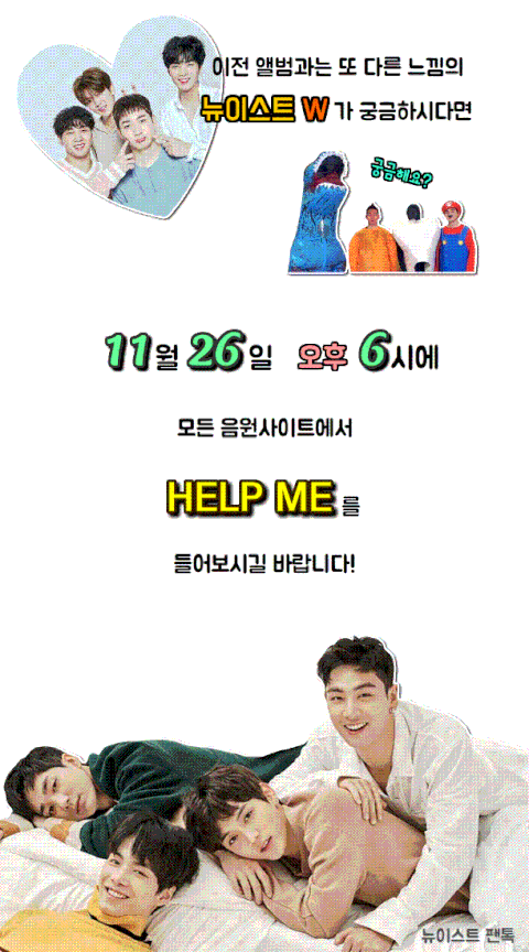 ✔뉴이스트W 타이틀곡 HELP ME 뮤비가 드디어 공개되었쏠 한번씩 봐주쏠⚘뮤비 주소 : https://youtu.be/TrIkYfYc3Ks⚘ '나, 너에게' 할 말이 있쏠⚘ 팬톡 러브들 동굴 밖으로 나오면 'I hate you'라는 거 기억하쏠⚘ 나쏠단이 'Dal Segno' 외칠 테니 팬톡 러브들은 Segno 있는 동굴로 돌아오쏠⚘ 엔터톡 유저 분들 월요병이 두렵다면 'Wi-Fi' 빵빵한 곳에서 뉴이스트W의 신곡 'HELP ME' 들으면 'Feels' 원더풀일 거쏠⚘ 'L.I.E'가 아니쏠⚘ 11월 26일 늦은 6시 뉴이스트W의 'HELP ME' 잊지 마쏠⚘ 그럼 쏠-바⚘