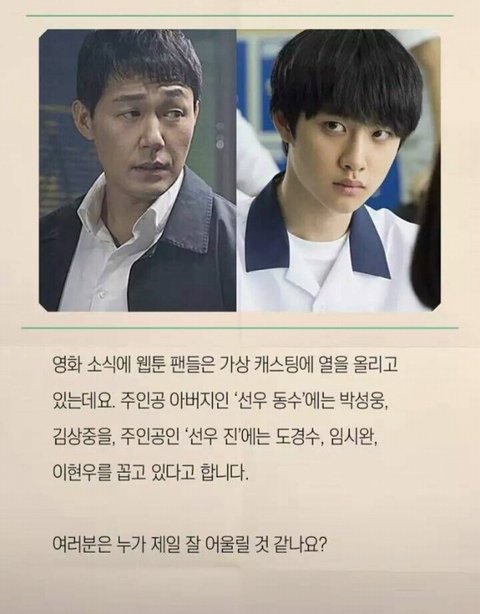 이현우 임시완 도경수 셋중 하나라도 되면 땡큐지ㅋㅋㅋ 근데 보통 웹툰이 원작인 영화나 드라마는 원작 캐릭터랑 전혀 싱크 안맞는 배우가 캐스팅 되는게 대부분이라 셋중 아무나 되도 감지덕지임