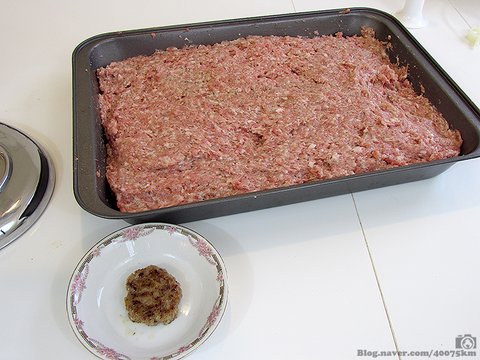 이렇게 다진 고기를 소시지로 만들기 전에 약간만 구워서 맛을 봅니다. 일단 소시지를 만든 다음에는 간이 안 맞아도 어찌 할 방도가 없으니까요.