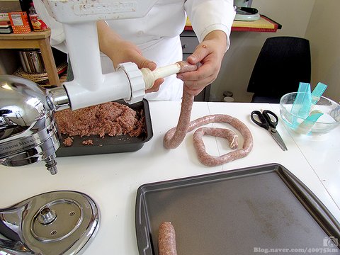 반죽기의 고기 믹서를 떼고 소시지 기계를 붙입니다. 물에 불려서 소금기를 씻어낸 소시지 껍질을 입구에 끼워줍니다.