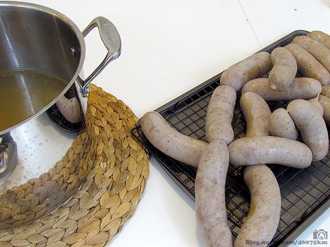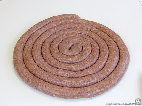다 채워넣은 소시지. 몇몇 레스토랑에서는 이렇게 둘둘 말아놓은 소시지를 통채로 구워서 잘라 팔기도 합니다.
