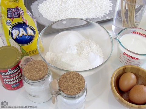 여기에서 가장 중요한 재료 두 가지를 꼽자면 바로 콘밀과 베이킹파우더입니다.