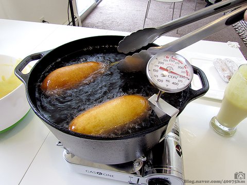 기름을 가열하고 반죽이 묻은 콘도그를 넣은 후 3분에서 5분 가량 튀기면 완성입니다.