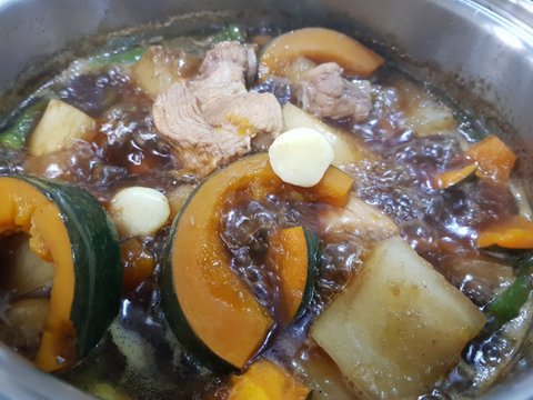 요 갈비찜이 내일먹을아침메뉴에요 저희부부는 아침에도 고기잘먹어욬ㅋㅋㅋ 단호박 무 마늘 양파넣어서 푹 익혀서 자작자작 밥에 비벼먹으면 꿀맛일듯해요!