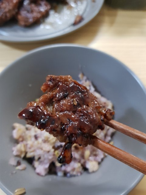떡갈비 구워서 밥에 올려 한입! 살짝타도 맛있어용