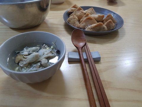 아침메뉴인 굴콩나물국과 유부초밥