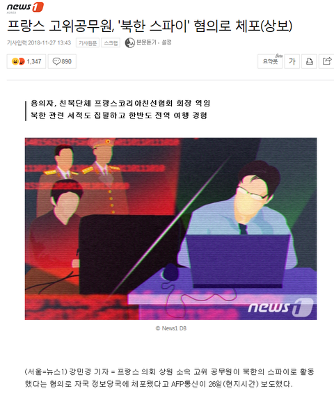 오늘 뜬 프랑스의 북한 간첩 기사. 프랑스의 고위공무원직에 북한의 간첩이 있었다는 내용