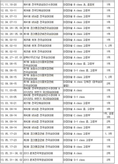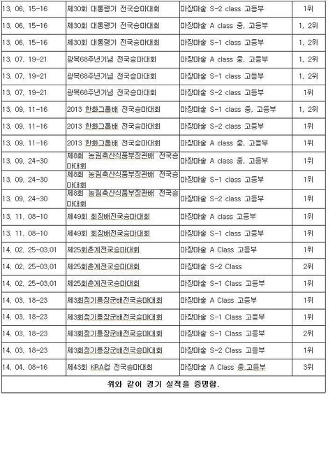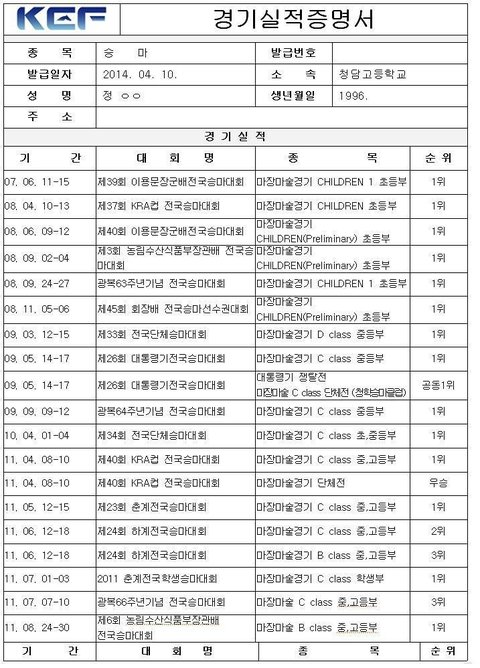 정유라 경기실적증명서. 년도를 보면 노무현 정부때에도 수상실적이 좋았다는 걸 알 수 있다.