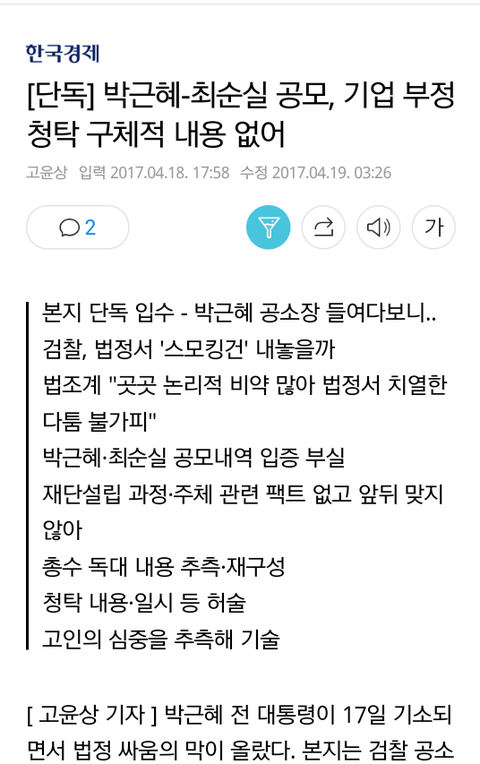 최순실이 뇌물을 받지 않았다는 기사도 나왔었다.