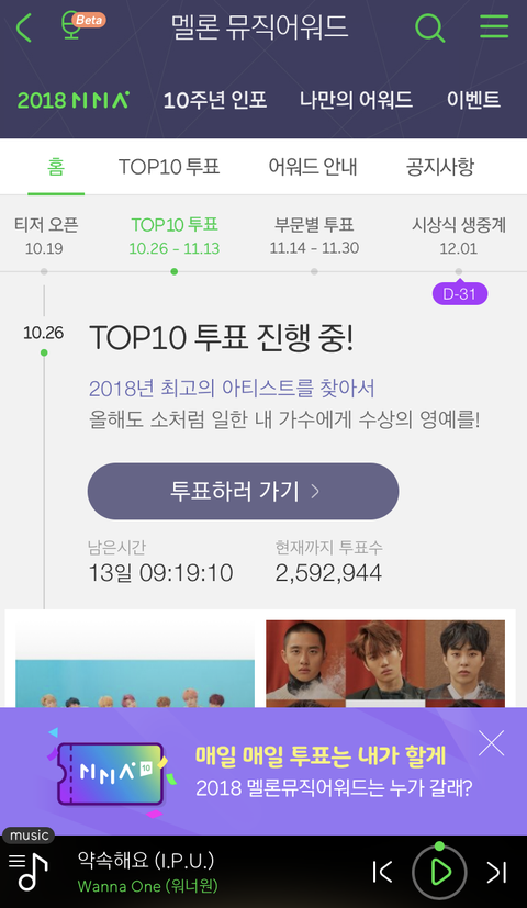 멜론이용권 있으면 하루에 3번까지 가능!!멜론 가서 본진한테 투표하자