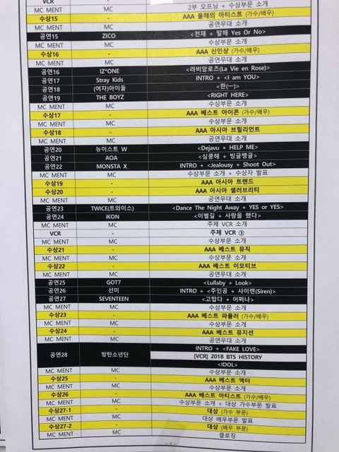 이건 2부 큐시트인데 중간중간에 상들 이름 봐 ㅋㅋㅋ 물론 수상을 한 배우들 가수들 다 대단한 아티스트들이야 근데 줄 거면 있어보이게 주든가.. 시상기준이 뭔지도 모르겠고 총체적 난국임