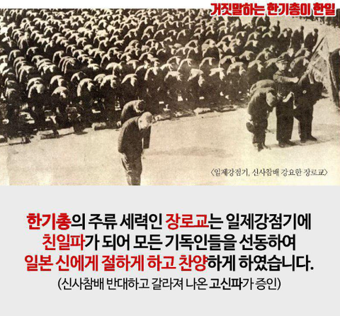 한국교회 보수진영의 역사 속 행태는 치욕스런 ‘만행’으로 평가되고 있다. 1884년 한반도에 첫 발을 내딛은 장로교는 반세기 만에 신앙의 정절을 저버렸다. 일제강점기인 1938년 9월 10일 조선예수교장로회는 ‘신사참배는 종교의식이 아니라 국가의식이다’라는 아전인수격 논리로 일제 천황신에게 참배할 것을 결의했다. 종교의식이 아니라던 신사참배는 결의 후 예배의 일환이 됐다.