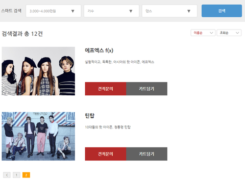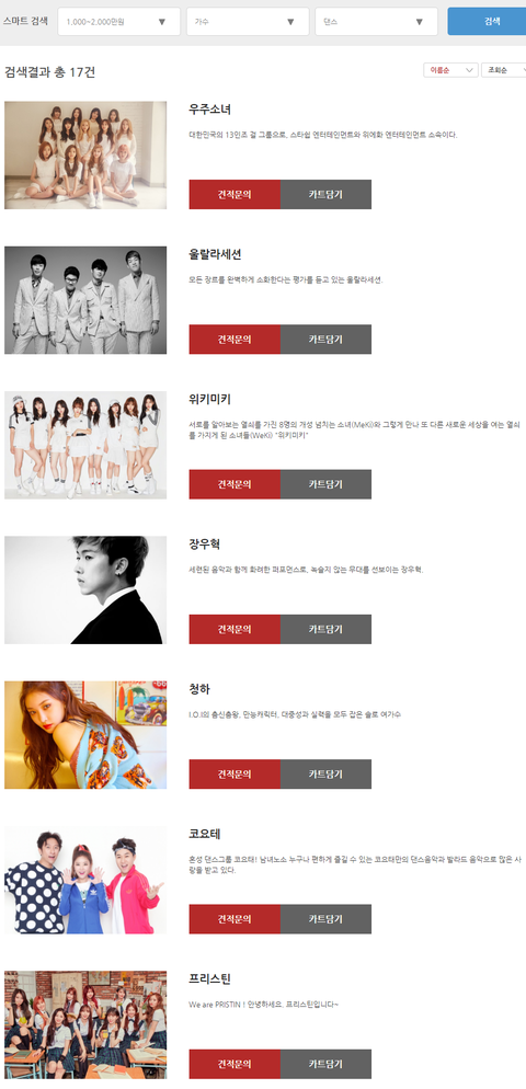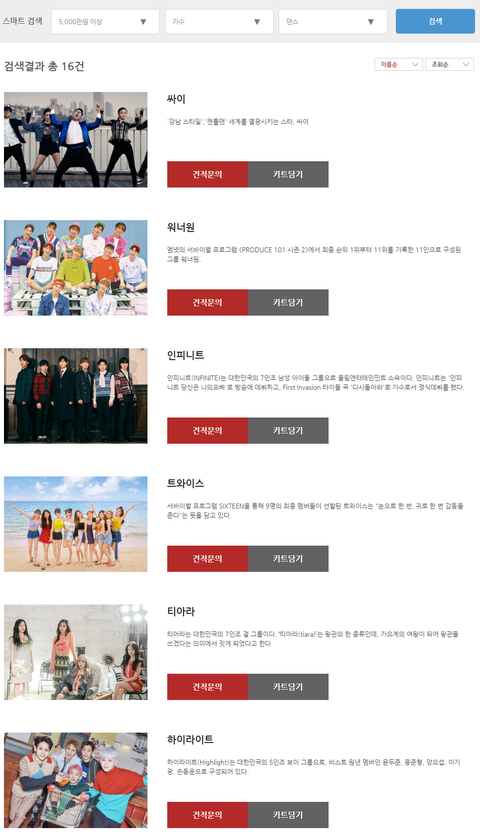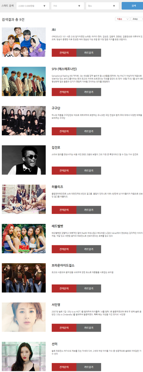 2000~3000만원 : JBJ, SF9, 구구단, 김건모, 러블리즈, 레드벨벳, 브라운아이드걸스, 서인영, 선미 등
