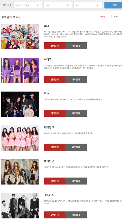 4000~5000만원 : NCT, 마마무, 빅스, 에이핑크, 여자친구, 젝스키스