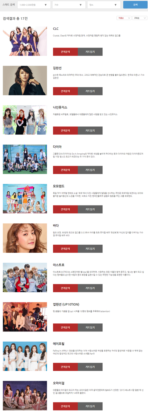 1000~2000만원 : CLC, 김완선, 나인뮤지스, 다이아, 모모랜드, 바다, 아스트로, 업텐션, 에이프릴, 오마이걸, 우주소녀, 울랄라세션, 위키미키, 장우혁, 청하, 코요테, 프리스틴 등