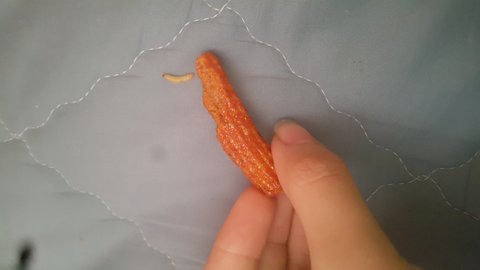 신당동 떡볶이 알지?? 먹다가 과자 가운데에 뚫린구멍 사이에서 유충이 나와서 깜짝 놀라 떨궜는데