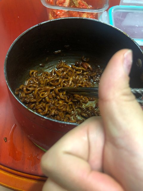 면 2개 끓인거에 물자박하게해서 짜장소스 한개 반정도 넣고 진짬뽕 소스 반개넣고 고춧가루 한수저넣고 쫄이면서 끓이면 존맛 라면2개는 기본인거알지 ? 그럼모두맛저