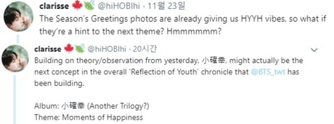 시즌그리팅 사진들은 화양연화를 떠올리게 해. 그럼 다음 앨범 테마에 대해 힌트 주는건가????