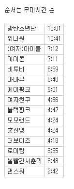 2018 MMA 가수별 무대시간