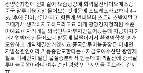 광양시장은 중국으로 부터 알루미늄공장(중금속+미세먼지주범+1급 발암물질)을 광양으로 들어오는걸 허락해줬어