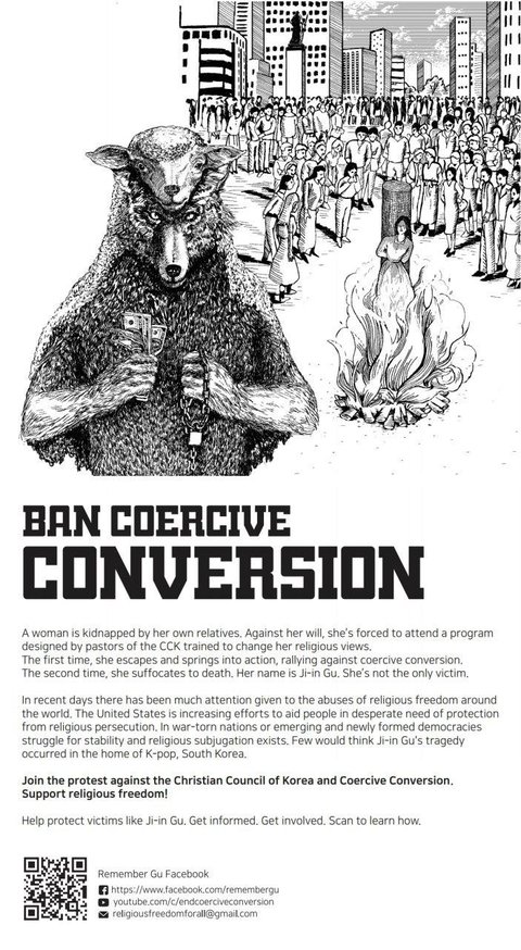 특히 이 매체는 “전시국가나 신흥 국가들에서 종교탄압이 일어나기도 하지만 케이팝(K-Pop)의 고향인 대한민국에서 강제개종에 의한 살인이 발생했다고 생각할 사람은 없을 것”이라며 “한기총과 강제개종에 대항하는 시위를 도울 것과 구지인 씨와 같은 희생자들의 보호에 관심을 가지고 동참해줄 것”을 호소했다.