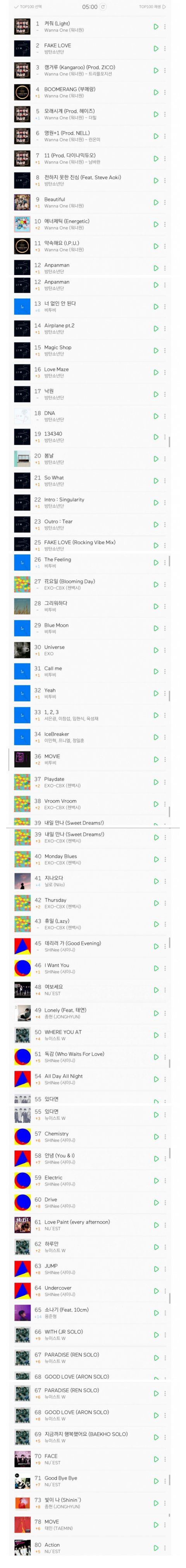 엑소 워너원 컴백으로 차트 상위권에 수록곡부터 예전곡까지 다 올라옴