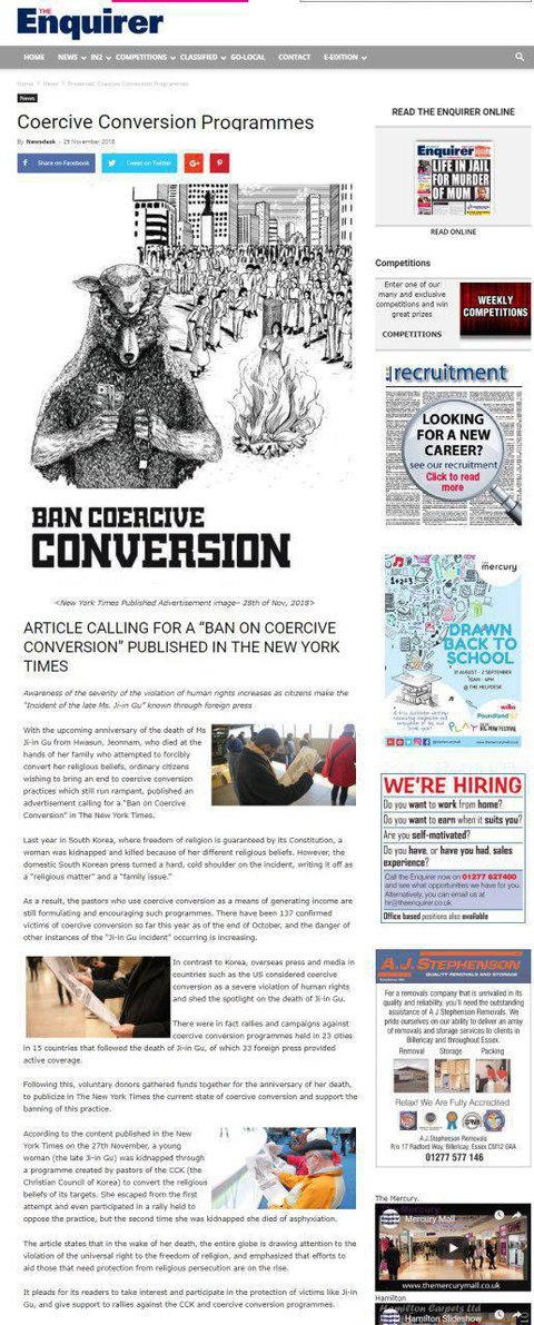 안타깝게도 신문엔 슬픈 소식이 실리게 되었는데요.바로 "강제개종으로 사망한 구지인양"에 관한 기사입니다.이렇게 외국에서도 심각하게 생각하고 있는 사항이기에,대한민국 국민인 우리들도 강제개종에 대해 관심을 가져야 하지 않을까 합니다.