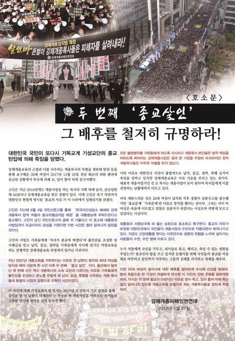 지난 1월에 강제개종으로 사망한 구지인양!구지인양의 사망은 많은 국민들의 마음에 분노를 불러일으켰습니다.그럼에도 불구하고 아직도 강제개종은 대한민국 땅에서 빈번히 자행되고 있으며, 수 많은 피해자들이 발생하고 있습니다.